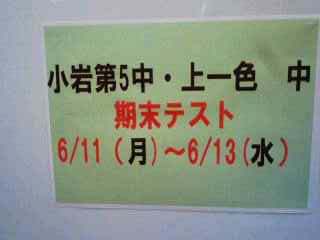 小岩プラザより定期テスト対策講座のお知らせ 小岩プラザ近隣の中学校では期末テストに入りました。 先陣は小岩第五中と上一色中です。 小岩プラザでは、定期テスト準備のための講座・つまり「定期テスト対策講座」を設けております。 今年初めて定期テストを受ける1年生にとっては不安だらけのようで、「先生、~の勉強の仕方を教えてください/~はどのように覚えたらいいんですか?・・・」と質問ぜめです。 まずは提出物が最優先です。それからが勝負ですよ。 目標点目指してがんばろう!!